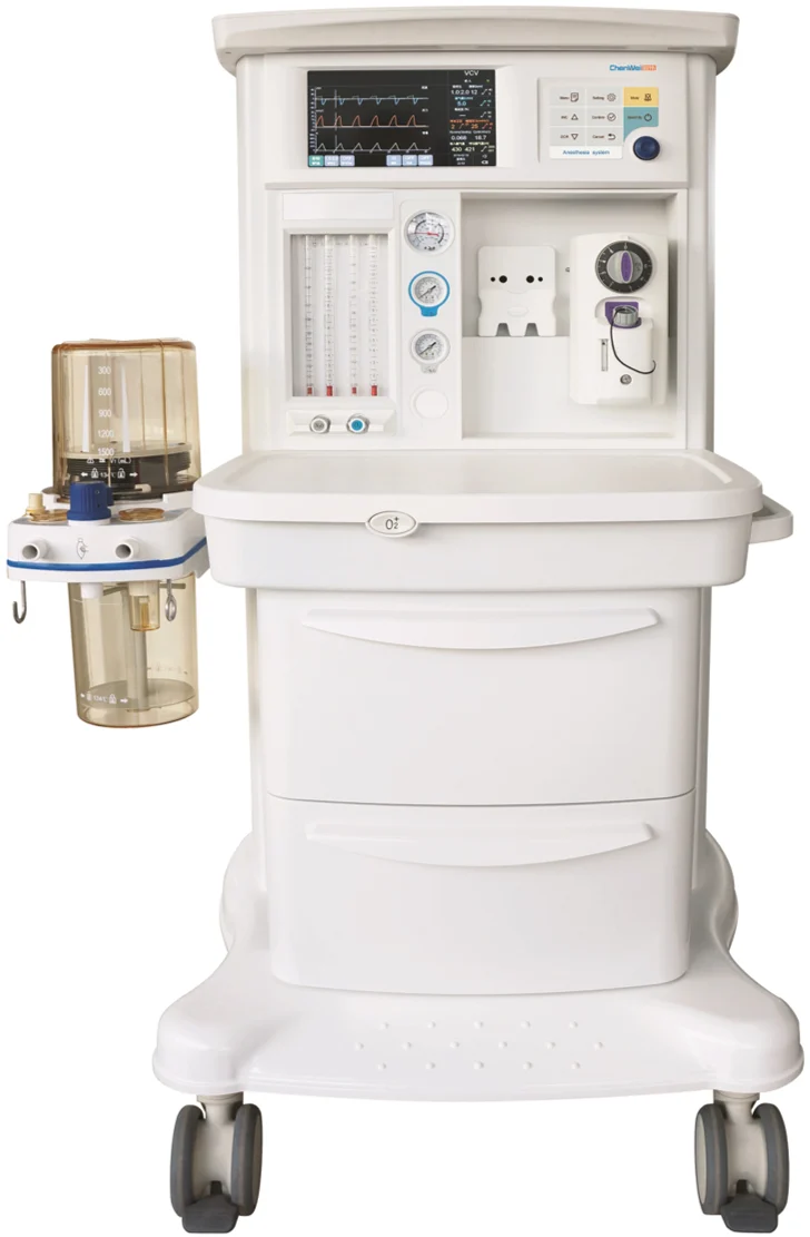 Integrated breathing circuit with APL valve, excellent tightness. Replacing drive bellow is NOT required when operating Adult/pediatric anesthesia . Applied with 1 high-precision vaporizers. (Selectatec). 10.1 inch screen. Real-time detection for loops, Paw, BPM, VT and compliance. Comprehensive monitoring capabilities include ventilation parameters monitoring,preset parameters, alarm indication and breathing waveform monitoring. ACGO available to connect with T/Bain circuit for open operation.(Optional)