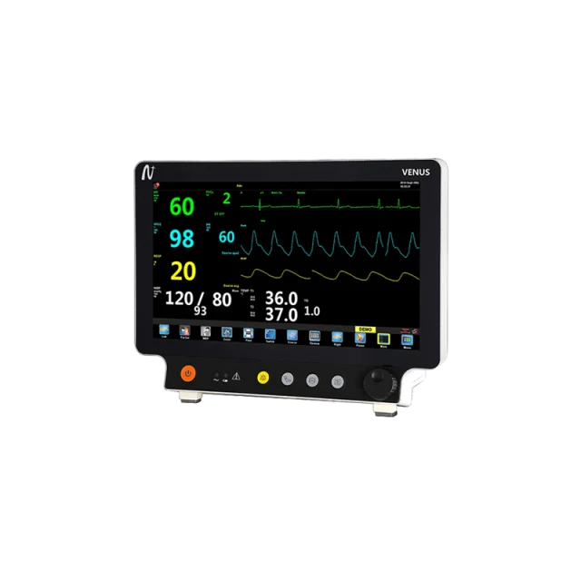 Venus menawarkan monitor pasien canggih dengan layar sentuh HD TFT LCD 15,6 inci yang memiliki desain layar datar penuh, lebih mudah dibersihkan, serta tidak mudah menumpuk debu. Dengan fitur lengkap dan fleksibilitas tinggi, alat ini memenuhi kebutuhan pemantauan di ICU, CCU, dan NICU. Resolusi tinggi dan tampilan data yang lebih luas memberikan kemudahan dalam analisis kondisi pasien secara real-time.